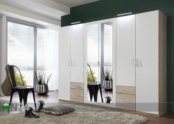 Laadukkaasta kalustelevystä valmistetussa vaatekaapissa on kuusi ovea ja neljä laatikkoa, keskimmäisissä ovissa on… Lue lisää »