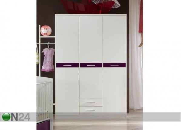 Kolmiovinen vaatekaappi on valmistettu valkoisesta kalustelevystä, violetit osat ovat korkeakiiltoiset – kaapin sisusta… Lue lisää »