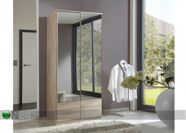 Kalustelevystä valmistetussa vaatekaapissa on kaksi peiliovea – kaapin sisusta on harmaa – kaapissa… Lue lisää »