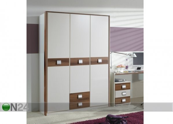 Kalustelevystä valmistetussa vaatekaapissa on kolme ovea ja kaksi laatikkoa – kaapin sisusta on… Lue lisää »