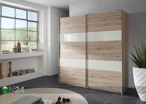 Liukuovinen vaatekaappi on valmistettu kalustelevystä, etupaneelit on osittain lasia – kaapin sisusta on… Lue lisää »