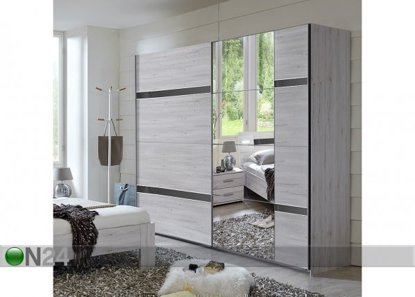 Liukuovinen vaatekaappi on valmistettu kalustelevystä, etupaneeleissa osittain peilipäällyste – kaapin sisusta on harmaa… Lue lisää »