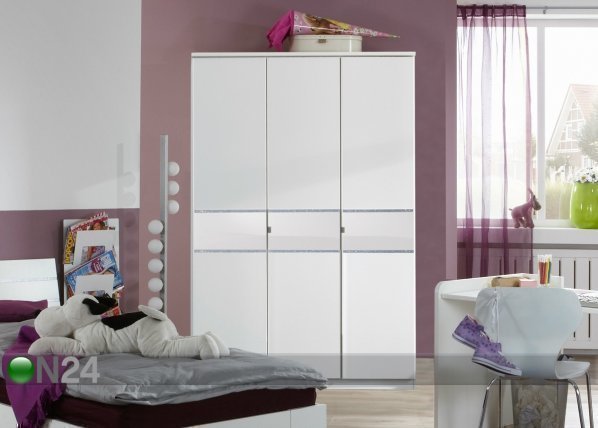 Kolmeovinen vaatekaappi on laadukkaasta kalustelevystä, jokaisen oven keskellä on yksityiskohta valkoista lasia -… Lue lisää »