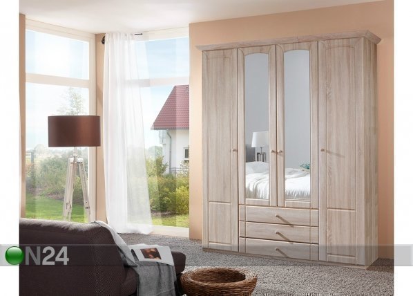 Neliovinen vaatekaappi on valmistettu kalustelevystä, keskimäisissä ovissa on peili – kaapin sisusta on… Lue lisää »