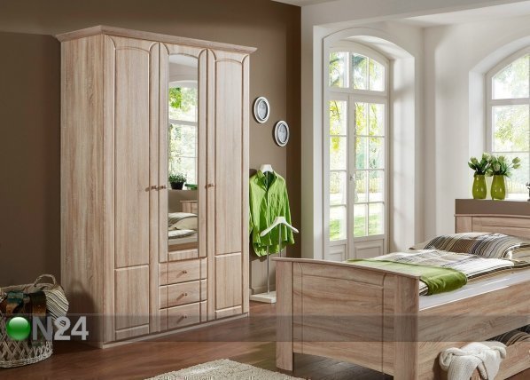 Kolmiovinen vaatekaappi on valmistettu kalustelevystä, keskimäisessä ovessa on peili – kaapin sisusta on… Lue lisää »