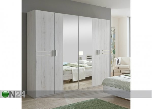 Neljiovinen vaatekaappi on valmistettu kalustelevystä, keskimmäiset ovet on osittain päällystetty peilillä – koristeena… Lue lisää »