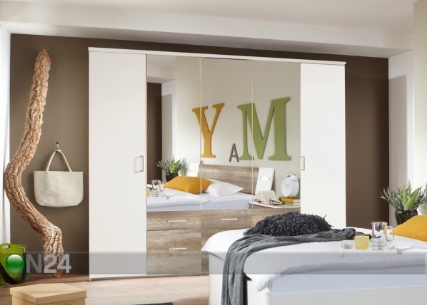 Viisiovinen vaatekaappi on valmistettu kalustelevystä, kolmessa ovessa on peili – kaapin sisusta on… Lue lisää »