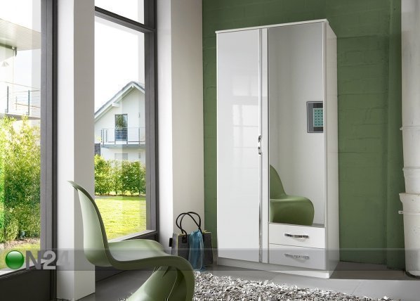 Kaksiovinen vaatekaappi on valmistettu kalustelevystä, vasemman puoleisessa ovessa ja laatikoiden etupaneeleissa on korkeakiilto… Lue lisää »