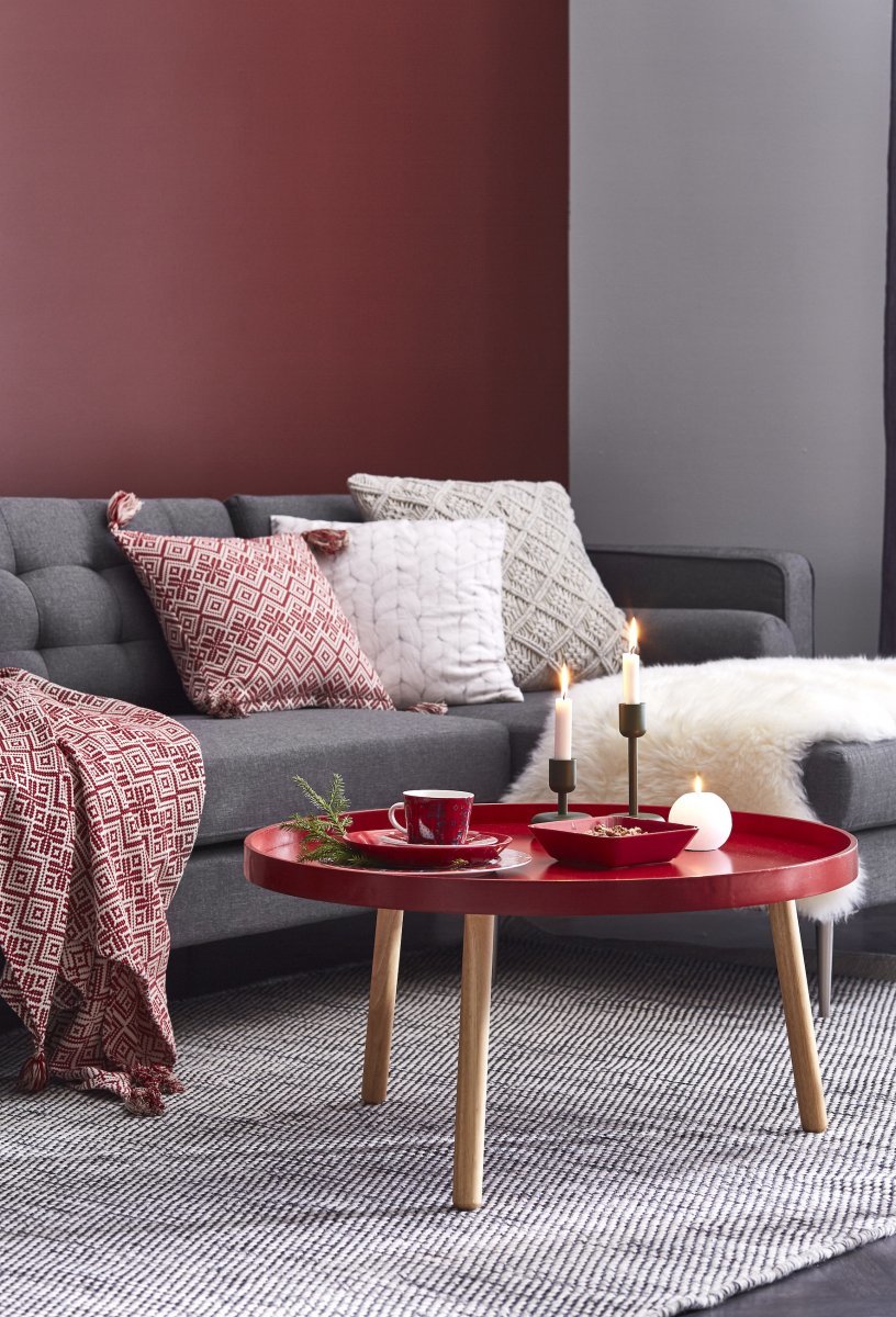 Moderni pyöreä Solo-1 sohvapöytä puujaloilla punainen kansi, jalat luonnonväriset puuta kansi mdf 79×40