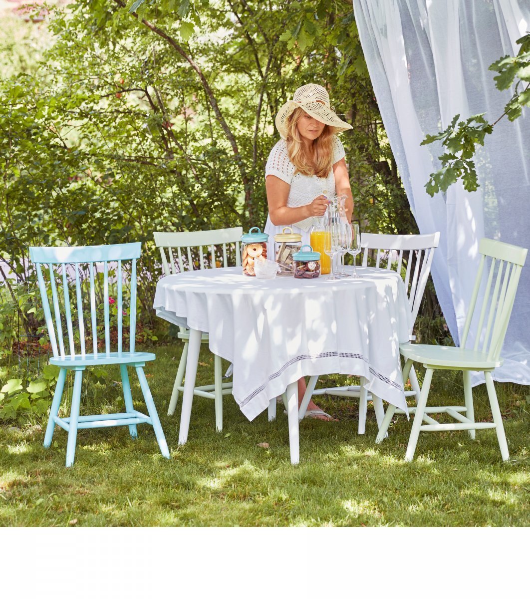 Vaaleansininen Sommarstad-tuolipari sopii keittiötuoleiksi ja mökkikalustukseen. Tilaa massiivipuutuolit Hobby Hallista & yhdistä Sommarstad-pöytään!