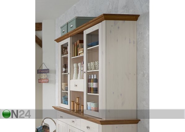 Ylä-vitriinikaappi on valmistettu laadukkaasta männystä – viimeistelty valkoisella petsillä / karniisi tummanruskealla, männynruskealla… Lue lisää »