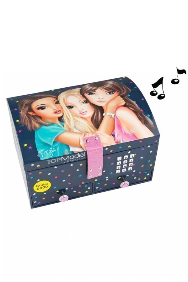 Säilytä korut turvallisesti TOPModel-korurasiassa, jonka voi avata vain salaisella, itse valitulla koodilla. Soittorasia soittaa TOPModel-melodiaa 20 sekunnin ajan ennen aukeamistaan. Mitat: 14,3 x 20 x 12,4 cm