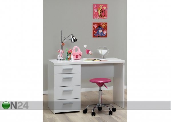 Yksinkertaisen tyylikäs kirjoituspöytä – valmistettu fooliumpinnoitetusta kalustelevystä – neljä metallikiskoilla liukuvaa laatikkoa -… Lue lisää »
