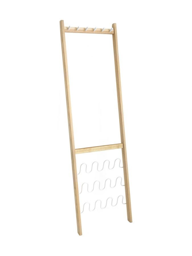 Minimalistisen tyylikäs teline pitää vaatteet ja kengät järjestyksessä sekä toimii näyttävänä katseenvangitsijana. Seinään kiinnitettävässä telineessä on kuusi vaatekoukkua sekä tilaa kuudelle kenkäparille.