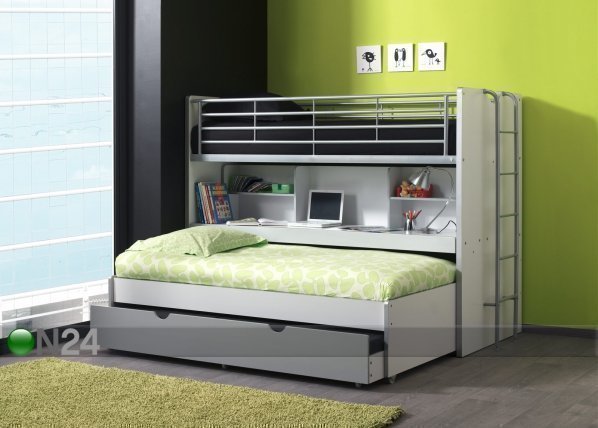 Kerrossängyssä makuusijat kolmelle, valmistettu laadukkaasta kalustelevystä – metalliset tikkaat sijoitettavissa oikealle tai vasemmalle… Lue lisää »