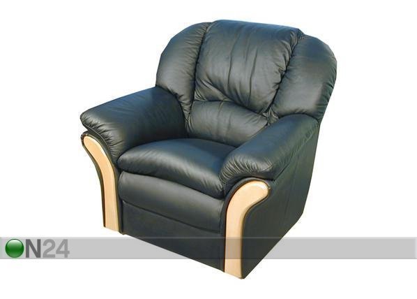 Istuin- ja selkänojatyyny sekä käsinojien päälliset ja sisäpuolet on verhoiltu aidolla nahalla -… Lue lisää »