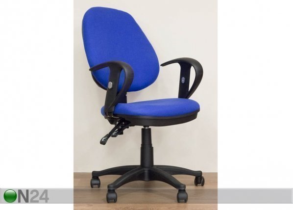 Työtuolin istuin on verhoiltu sinisellä kankaalla, pehmusteena on vaahtomuovi – istuinkorkeus 44-54 cm… Lue lisää »